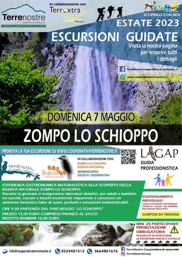Il giorno 7 maggio 2023 in collaborazione con la Cooperativa di comunità Terrenostre, scopriremo insieme la riserva naturale Zompo lo Schioppo attraverso un’escursione sul sentiero natura e laboratori didattici dedicati a bambini ed adulti. Sarà possibile prenotare l’escursione dal sito della Cooperativa Terrenostre all’indirizzo www.cooperativaterrenostre.it