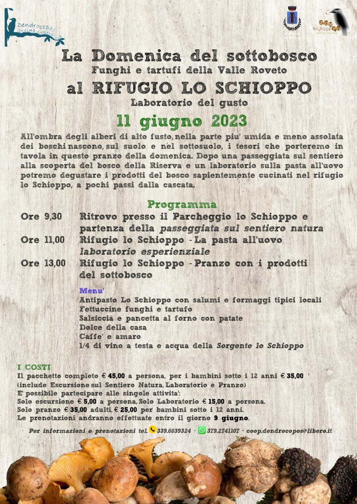 All’ombra degli alberi di alto fusto, nella parte più umida e meno assolata dei boschi nascono, sul suolo e nel sottosuolo, i tesori che porteremo in tavola in questo pranzo della domenica. Dopo una passeggiata sul sentiero alla scoperta del bosco della Riserva e un laboratorio sulla pasta all’uovo potremo degustare i prodotti del bosco sapientemente cucinati nel rifugio lo Schioppo, a pochi passi dalla cascata.