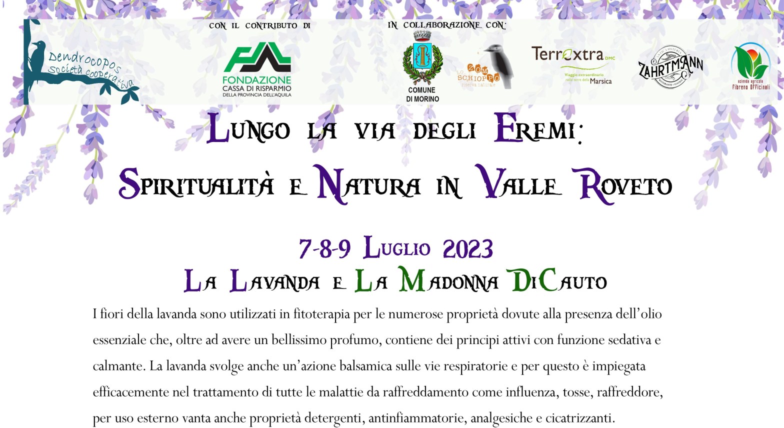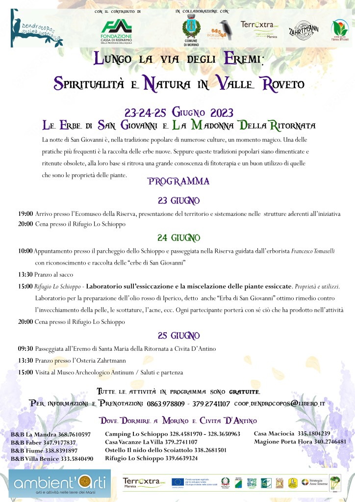 La Società cooperativa Dendrocopos presente “Spiritualità e natura in Valle Roveto” un calendario di eventi realizzato grazie al contributo della Fondazione Carispaq e in collaborazione con il Comune di Morino, la Riserva Naturale Zompo lo Schioppo, DMC Marsica, Osteria Zahrtmann e Azienda Agricola Fibreno Officinali.
