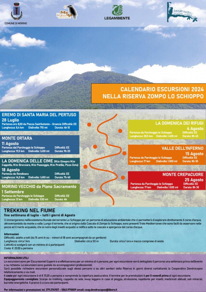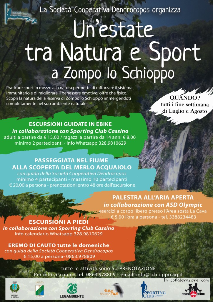 L’estate nella Riserva Naturale Zompo lo Schioppo quest’anno sarà ricca di esperienze, attività, sport…ce n’è per tutti i gusti! In collaborazione con Sport e Fitness Outdoor, Luca De Filippis di ASD Olympic di Civitella Roveto e le guide della Società cooperativa Dendrocopos, nei mesi di Luglio e Agosto sarà possibile prenotare escursioni a piedi, in ebike, passeggiate nel fiume e palestra all’aria aperta. Tutte le attività saranno seguite da professionisti che vi guideranno alla scoperta di modi diversi di vivere la natura. Per dettagli sulle singole attività, costi e modalità di prenotazione, troverete tutti i riferimenti in locandina. Contattateci, condividete e prenotate!!!
