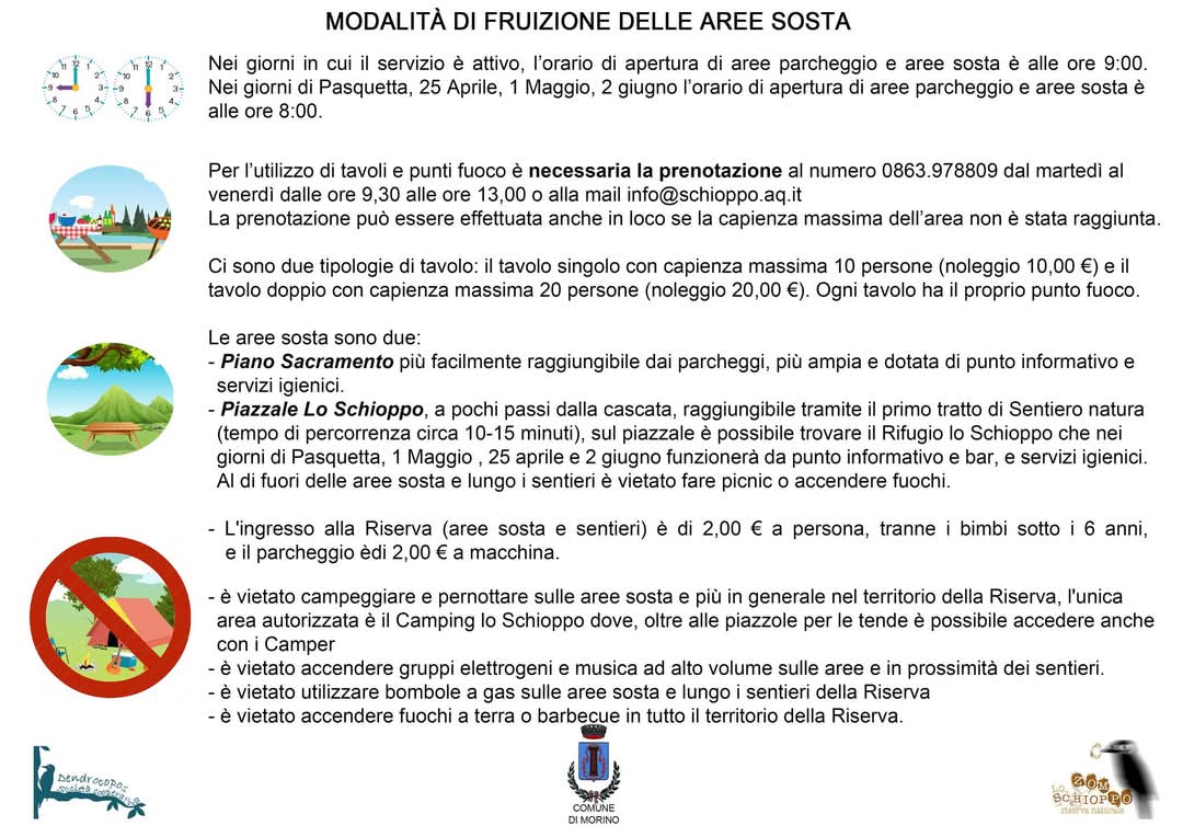 Attualmente le aree sosta sono 𝗔𝗟 𝗖𝗢𝗠𝗣𝗟𝗘𝗧𝗢 ma sarà possibile comunque accedere ai sentieri. Per ulteriori informazioni ☎️ 0863.978809 mar-ven 9,30-13,00 📧 info@schioppo.aq.it